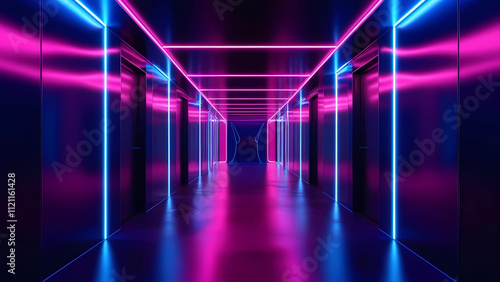 Neon lights corridor, futuristic interior