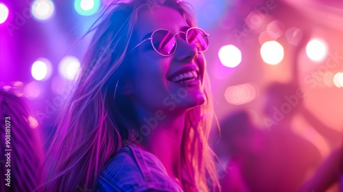 Neon Lights, Smiling Girl in Sunglasses, Pink and Blue Tones, Party Mood, Neon, Party, Purple