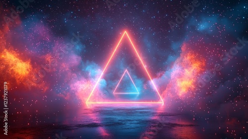 Neon triangle portal, cosmic clouds, night sky, fantasy background, ideal for sci-fi design