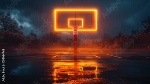 Neon-lit basketball court glowing in vibrant orange against a rainy backdrop, reflecting dramatic puddles and creating a moody, cinematic urban setting