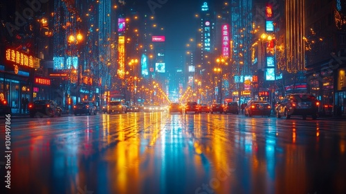 Neon-lit street filled with festive lights and reflections at night. Generative AI