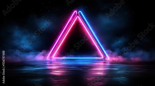 Neon-lit triangular tunnel creates a retro ambiance with glowing pink, blue, and purple lines in a dark futuristic setting
