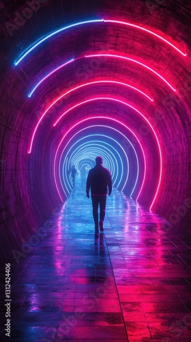 Neon-lit tunnel with a solitary figure walking in a vibrant and colorful atmosphere