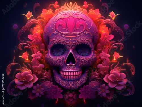 Neon-style Día de Muertos poster design with glowing sugar skulls, purple and pink gradient background