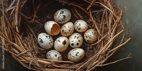 Nest with eight speckled quail eggs in brown straw, showcasing a natural arrangement with one egg partially cracked on a soft green background.