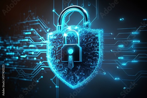 Network security concept, data security lock with blue neon effect。AI technology generated image