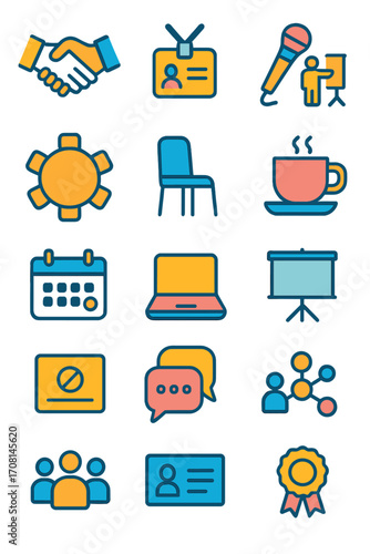 Networking Events icons in modern flat vector style in minimalistic vibrant color design: handshake icon, name badge, microphone, presentation board,