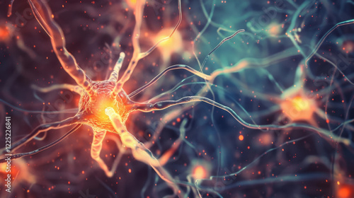Neurons glowing in vibrant network, showcasing intricate connections and activity. This captures beauty of neural communication and brain function
