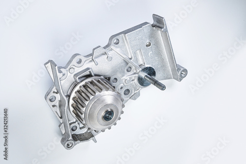 New metal automobile pump for cooling the engine of a water pump on a gray background. The concept of new spare parts for the car engine
