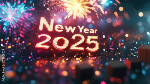 "New Year 2025" in glowing computer font with confetti floating in the air and fireworks bursting in the sky.