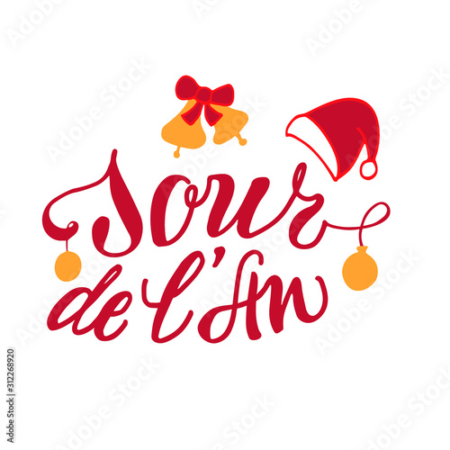 New year's Day. Digetized hand drawen lettering in brush style with holiday icons in french for greeting card, title, print. red and orange on white background