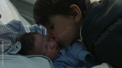 Newborn baby being kissed on the cheek by brother at hospital clinic after birth, first day of infant in the world being welcomed by family in a heartwarming gesture