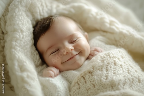 Newborn baby with closed eyes is smiling peacefully while sleeping in soft white knitted clothes