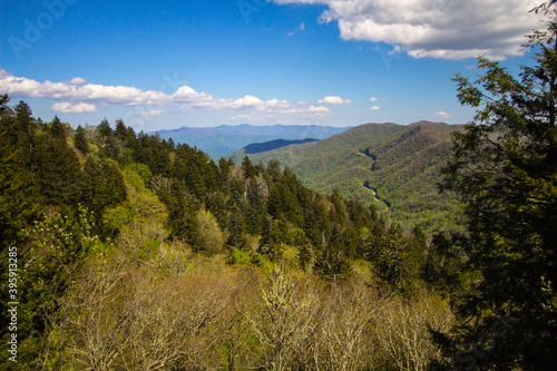 Newfound Gap road winds through the steep rugged terrain of the Great Smoky Mountains National Park in Tennessee.