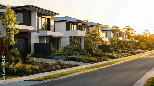 Newly completed suburban homes with contemporary architecture, surrounded by