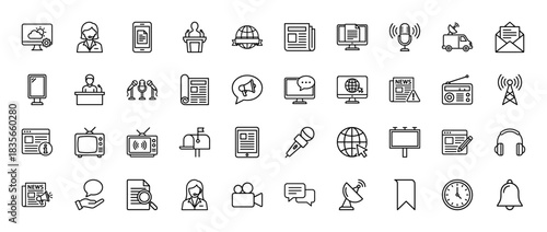 News and media line icon set. Vector pictograms of television, microphone, newspaper, radio, and advertising, thin outline illustration.