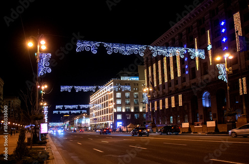 Night city street decorated with festive holiday lights illuminated buildings and moving cars creating vibrant urban Christmas atmosphere and winter celebration mood