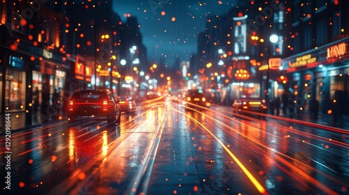 Night City Street with Blurred Lights and Reflections on Wet Road. Generative AI
