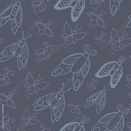 Night creatures seamless vector pattern with moths and fireflies. Hand drawn insects.