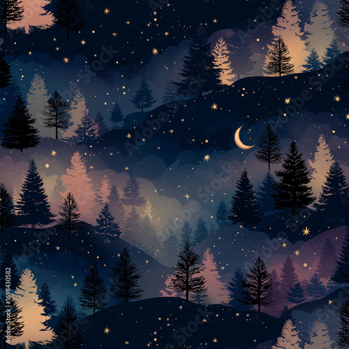 Night forest landscape illustration with crescent moon shining over pine trees and starry sky