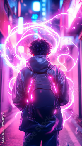 Night Person Neon Streets; futuristic urban setting; vibrant lights