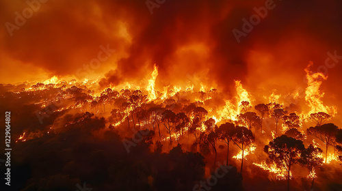 Night wildfire engulfing forest, aerial view