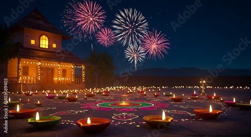 Nighttime Diwali Festival Celebration: 3D Render of Festive Lights and Fireworks AI Generated