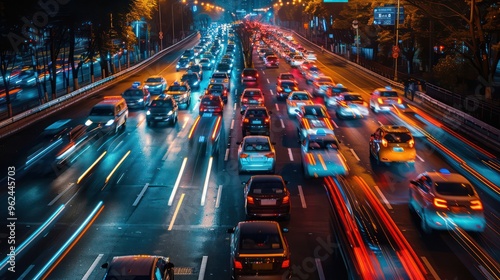 Nighttime traffic scene with colorful light trails from vehicles on a busy urban road.