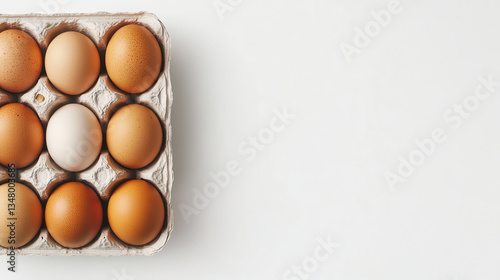 Nine brown eggs and one white egg in a carton.