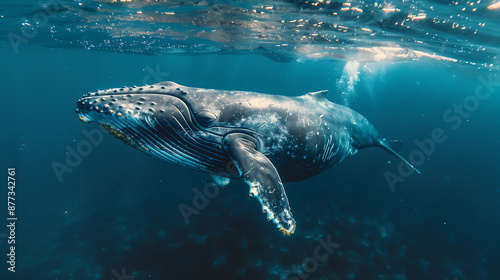 North Atlantic Right Whale: The North Atlantic right whale is one of the most endangered large whale species. Humpback whale playfully swimming in clear blue ocean. Humpback.