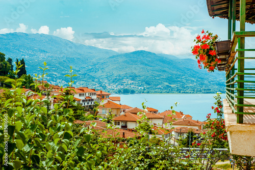 North macedonia. Ohrid. Roofs buildings and houses alonge lake shore with mountains and lake on background