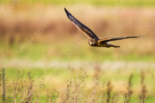Northern Harrier Hawk Hunts Over Marsh
