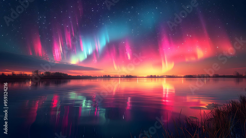 Northern Lights Reflection on Calm Lake - Illustration