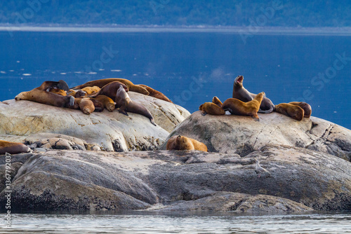 Northern (Steller) sea lions, (Eumetopias jubatus), hauled out on South Marble Island, Glacier Bay National Park, Alaska