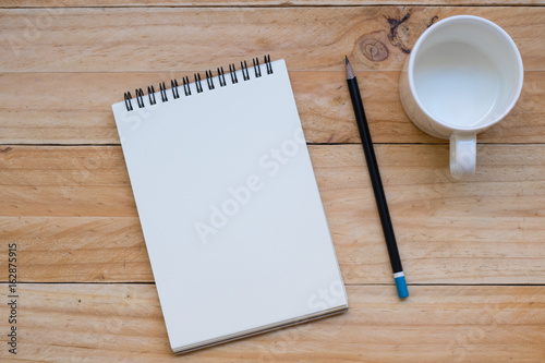 Notebook with pencil and blank white ceramic cup on wooden table