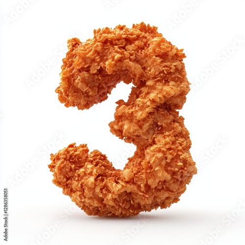 Number 3 made of crunchy spicy fried chicken fillet with a golden-red crisp texture isolated on a clean white background