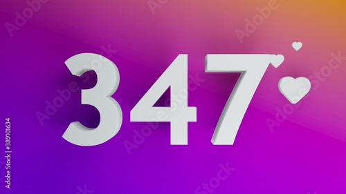 Number 347 in white on purple and orange gradient background, social media isolated number 3d render