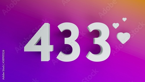 Number 433 in white on purple and orange gradient background, social media isolated number 3d render