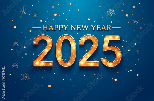 Numbers 2025 in gold on a blue background with snowflakes. Text happy new year