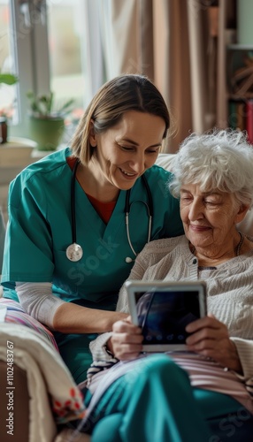 Nurse Assisting Elderly Woman with Virtual Family Call in Cozy Nursing Home Setting