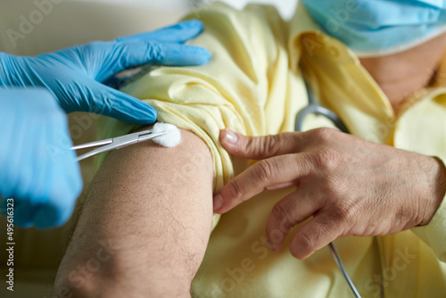 Nurse wiping injection site on arm of patient with cotton ball before vaccinate him against coronavirus