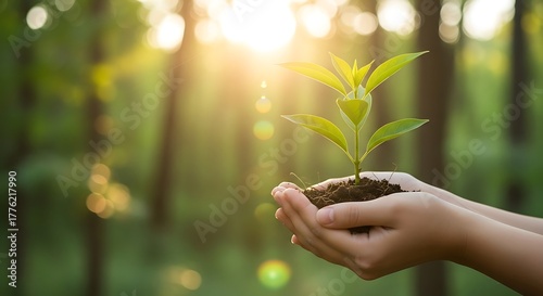 Nurturing hands gently cradle a vibrant green seedling, bathed in warm sunlight filtering through a lush forest, symbolizing new life, growth, and environmental care