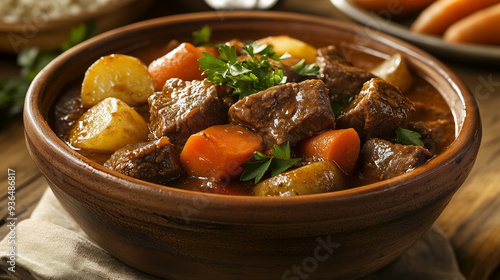 Obfita porcja gulaszu wołowego z miękkimi kawałkami wołowiny, marchewkami i ziemniakami, przyozdobiona świeżą pietruszką.