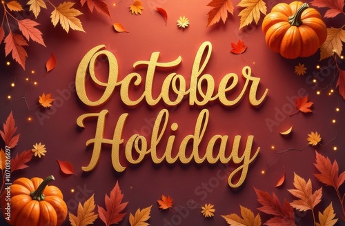 "October Holiday" in Ornate Calligraphy with Warm Autumn Colors, Pumpkins, and Fairy Lights