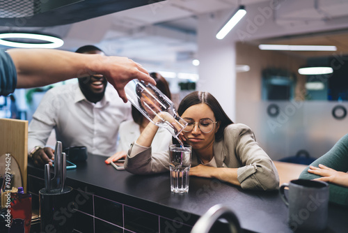 Office barman pouring water into glass for overworked female employee