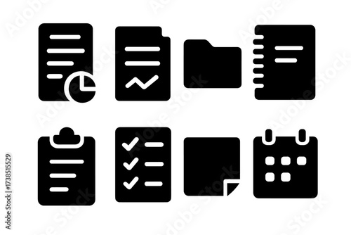 Office Document Icons. Solid, filled icon set of office documents: report, contract, folder, notebook, clipboard, checklist, sticky notes, calendar. [Solid,