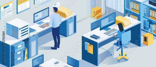 Office image: woman at tidy desk, man at cluttered desk both on computers in narrow space with office supplies. Modern, minimalist with light blue walls, natural light, functional yet busy.