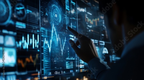 Office man finger touch hud, virtual screen with stock market changes, business candlesticks graph chart. Double exposure of blue and white lines, growing numbers, online trading