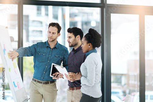 Office, meeting and whiteboard for teamwork, planning and erp notes with tablet for report. Man, woman and team for small business, discussion and collaboration for partnership or b2b project