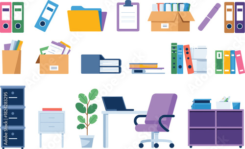 Office Supplies and Furniture Collection Flat Design Icons vector illustration
